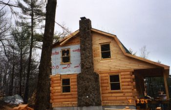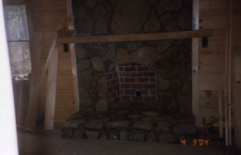 This log cabin has a chimney and fireplace with rustic raised hearth in thin stone veneer.